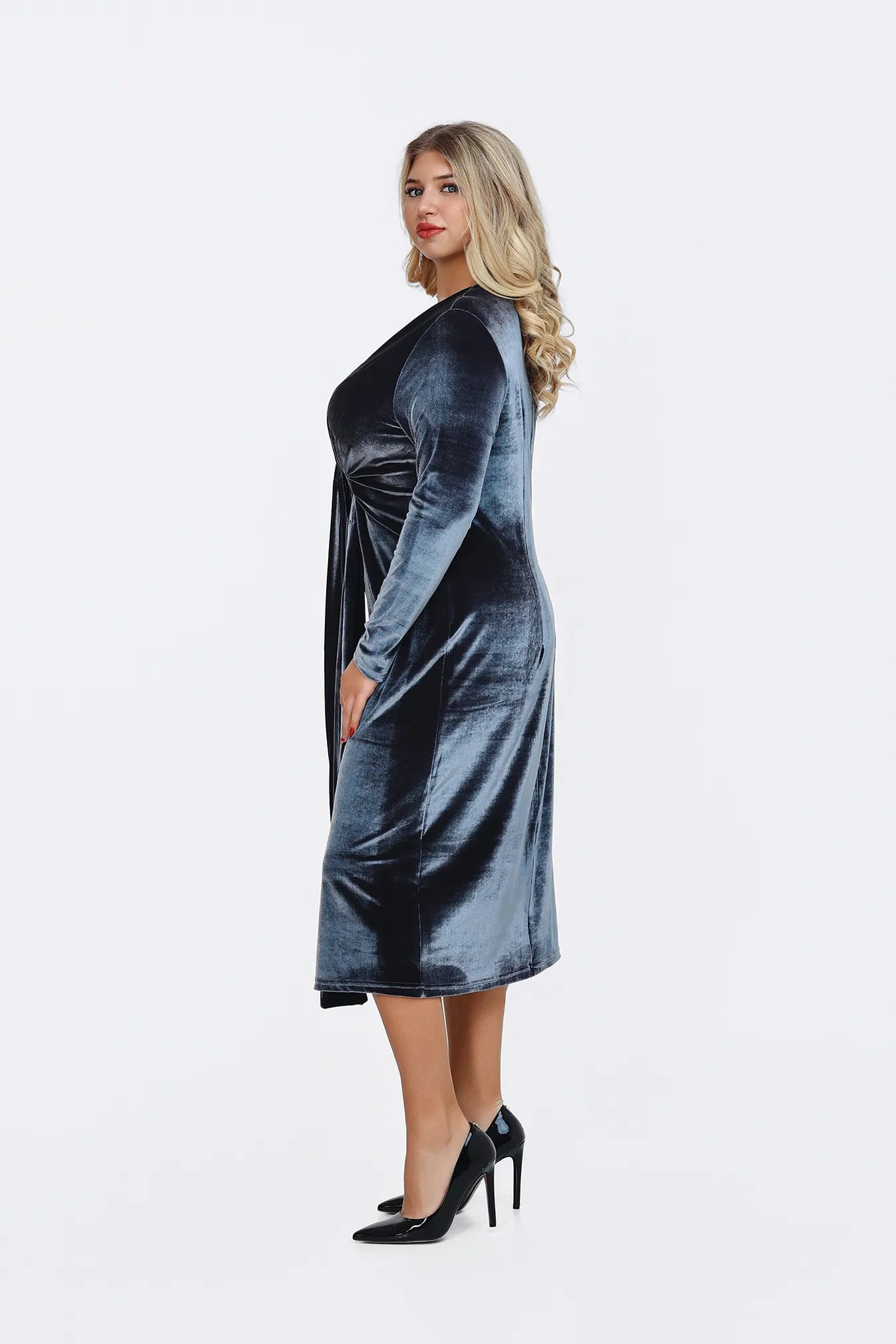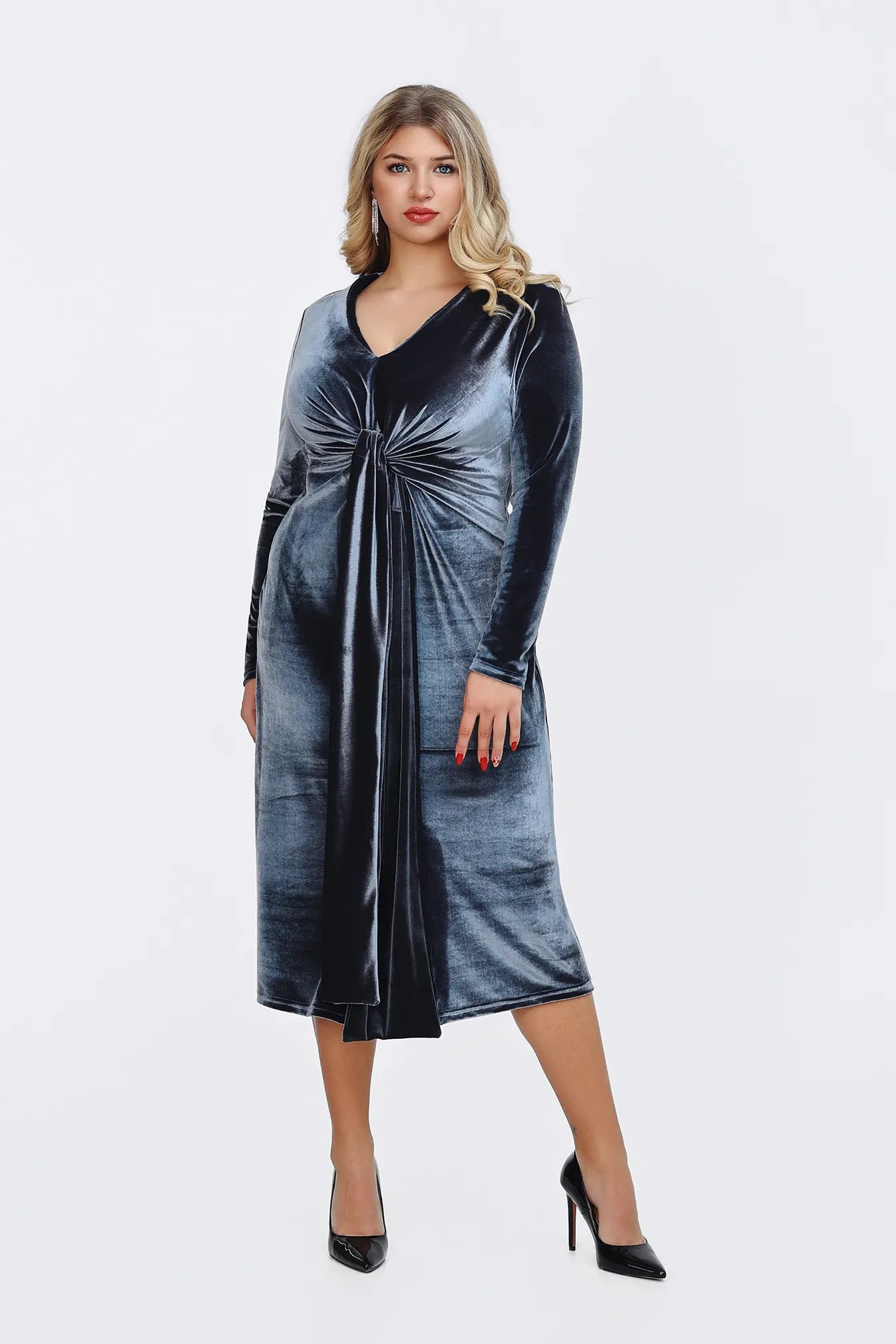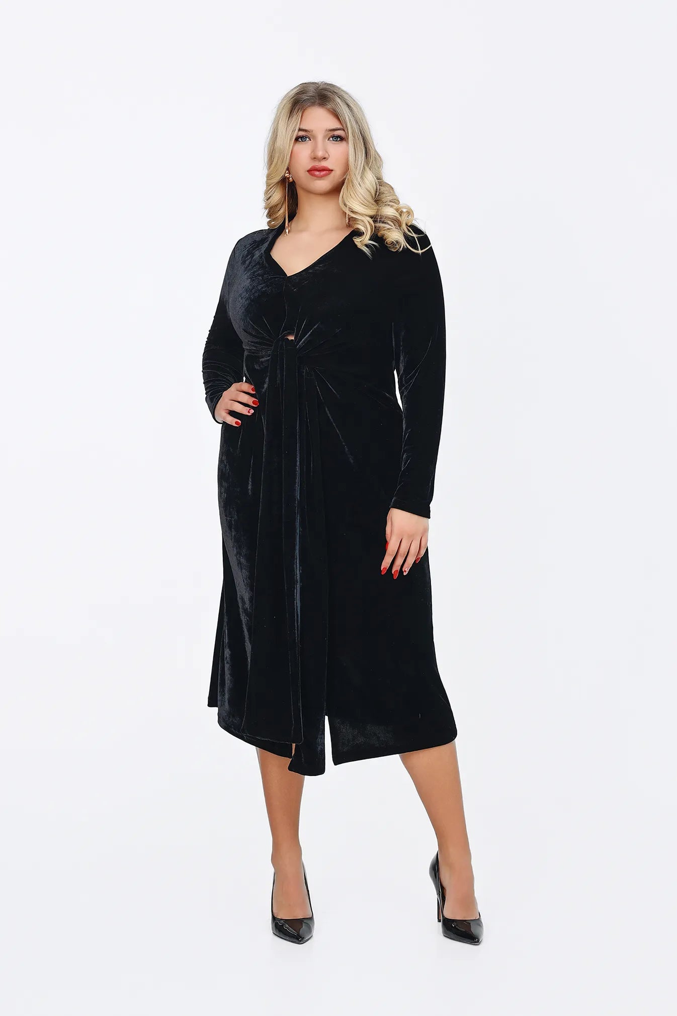 A Divina ruha a kortalan eleganciát és a luxus érzetét hozza el gardróbodba. Bársonyos, puha anyaga pazar fénnyel öleli körbe az alakot, a kényelem és a stílus tökéletes harmóniáját teremtve. A V-kivágás és a derékrészen található csomózás finoman hangsúlyozza a nőies vonalakat, miközben a ruha lágy esése biztosítja a kifinomult összhatást. A ruha több mély, gazdag színben is elérhető, hogy megtaláld a személyiségedhez leginkább illőt, legyen szó egy elegáns vacsoráról, egy színházi estéről vagy egy ünnepi eseményről. A Divina az a darab, amelyben a magabiztosság és a kifinomultság kéz a kézben jár.